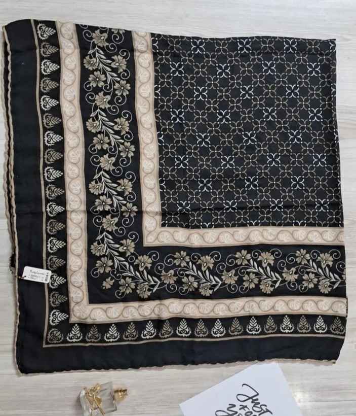 ✨بسم الله النور✨ نام محصول :روسری نخی سیااسکارف طرح دار ✅کیفیت کار عالی ✅طرح جذاب 🌻 ✅جنس نرم و لطیف 😍 ✅ قواره 140 ✅دور دست دوز 🪡🧵 ✅مجلسی سرخور عالی ✅ لیز نیست قیمت با احترام 390ت